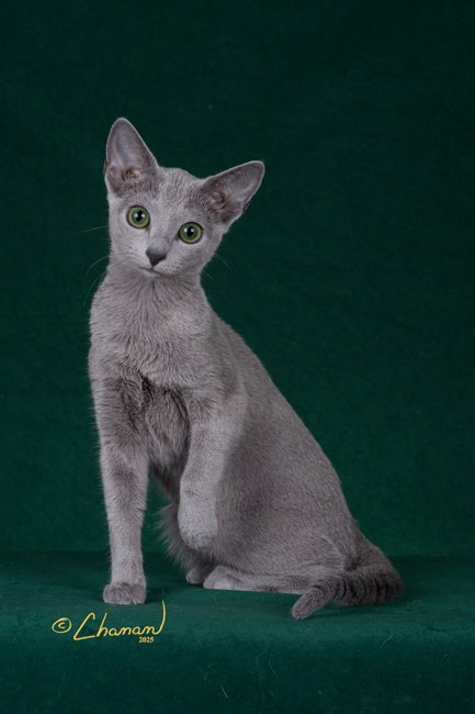 Lunaria is our elegant Russian Blue female from Starblue in Portand. Her presence is as captivating as her name. She adores being the center of attention, whether she’s curled up for a cuddle or dazzling the judges in the show ring. Her most stunning feature? A pair of luminous emerald-green eyes that seem to glow against her shimmering silver-blue coat. Lunaria’s gentle temperament and elegant beauty make her a treasured part of our home and breeding program.